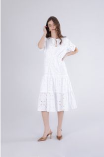 Abito midi in sangallo con maniche corte e balze increspate leggero e femminile. il ricamo traforato valorizza la silhouette ideale per look estivi eleganti casual chic o occasioni diurne. la modella è alta 171 cm e indossa la taglia s. vestibilità: regular.