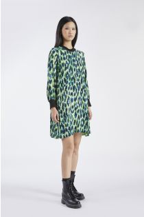 Ampio abito stampa animalier con polsini alti e scollo in maglia