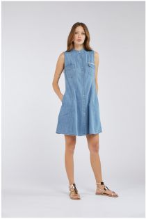 Abito chemisier smanicato e svasato realizzato in tela chambray con passamaneria applicata sui taschini e un sinuoso gioco di godet sul fondo che creano la svasatura e ampiezza al capo.