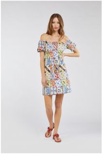 Abito corto con taglio a impero e scollatura arricciata che lascia delicatamente scoperte le spalle. Tre diverse tessuti stampati esclusivi fra cui scegliere per adattarsi ad ogni gusto.
