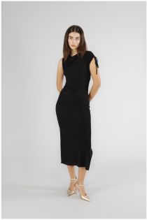 Abito smanicato in tessuto superstretch con coulisse alla spalla e drappeggio sul fianco. lunghezza sotto il ginocchio con spacco laterale da una parte. abito perfetto con scarpe con tacco alto per una serata romantica ed elegante.
