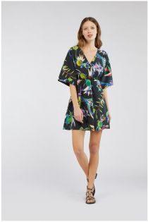 Abito fresco a confortevole, adatto a diverse fisicità, con una delicata arricciatura sotto il seno, un incrocio sullo scollo e le maniche a kimono con lunghezza 3/4.