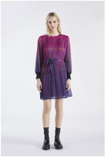 Abito dal gusto romantico realizzato in fil coupe stampato con il davanti plissettato. Cintura in vita che modella il tutto sulle curve e maniche arricciate.