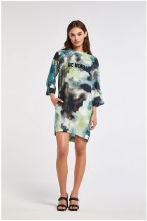 abito corto in tessuto fluido stampato e pailettes camouflage multiverde