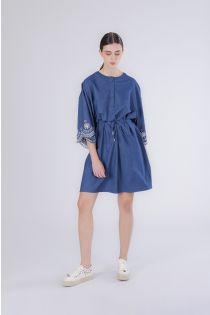 Abito corto in denim leggero da donna con maniche ricamate e fusciacca in vita. linea morbida e femminile perfetto per look estivi casual chic comfort quotidiano e stile raffinato. la modella è alta 171 cm e indossa la taglia s. vestibilità: regular.