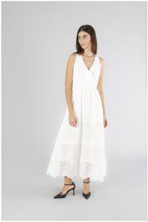 Abito lungo smanicato con scollatura incrociata realizzato in popeline di cotone con balze in tessuto sangallo. abito dallo stile romantico e femminile.
