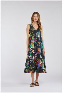 Fresco abito lungo con scollo a V e un gioco di balze increspate applicate sui lati che creano movimento e brio .Disponibile in tre stampe fantasia esclusive.