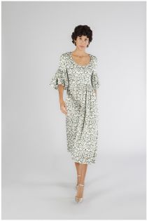 Abito in satin stampato con scollatura rotonda e maniche a campana. abito che esalta la silhouette e la linea pulita aggiunge un tocco di raffinatezza.