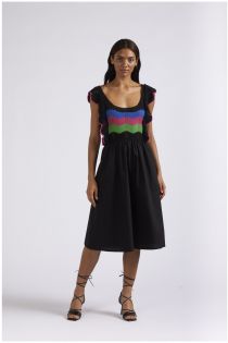 Abito smanicato lunghezza al ginocchio. il top è smacchinato con un filato misto cotone lavorazione crochet multicolor. la gonna è realizzata in popeline di cotone.