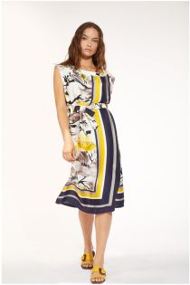 Elegante abito con modello a finto portafoglio in satin di viscosa stampato con motivo di righe e fiori. Contrasti tinta unita per bordatura allo scollo