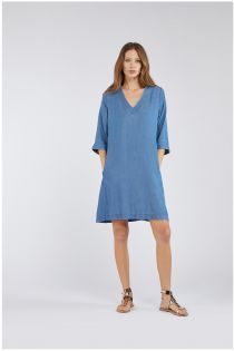 Abito svasato in tencel effetto jeans. Il capo presenta dei contrasti di tessuto stampato che bordano maniche e scollo.