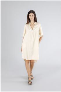 Abito modello tunica con dislivello di lunghezza tra davanti e dietro. realizzato in tessuto mistolino e inserto satin di viscosa. maniche al gomito. abito leggero e fresco da indossare nelle calde giornate estive.