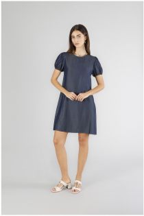 Abito modello tunica con maniche corte in tessuto in tencel jeans. abbottonatura sul retro. capo indispensabile da avere nel tuo armadio. da abbinare a una scarpa sportiva e un giubbotto di pelle per un look più sportivo oppure per un look unico ed elegante abbinalo ad un sandalo.