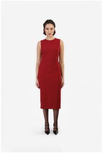 l'abito è smanicato e realizzato in tessuto bistretch. sul retro è presente un'apertura a goccia con accessorio dorato e chiusura posteriore tramite zip a scomparsa. piccolo spacco posteriore centrale. il capo ha un vestibilità aderente che valorizza la silhuoette perfetto per l'ufficio.