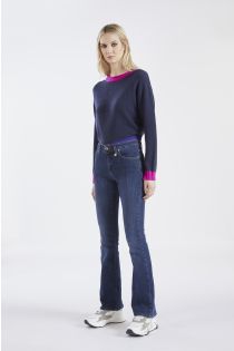 Pantaloni basico vestibilità zampa di elefante in tela denim superstretch.