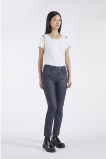 Denim vestibilità slim realizzati con una femminile tela superstretch con glitter oro. Prezioso bottone gioello decora il davanti.