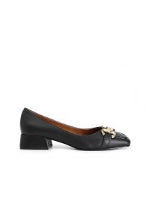 Ballerina in pelle dalla punta squadrata e morsetto dorato. calzatura perfetta per completare i look di ogni giorno con semplicità ma anche con stile. il tacco dalla forma quadrata è di 35mm e il soletto è in pelle.