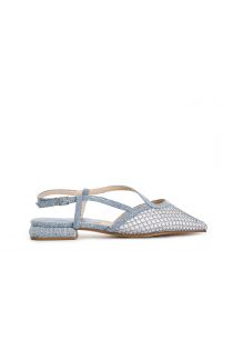 Ballerine in denim aperte dietro con cinturino sul retro e scollatura dalla forma asimmetrica. caratteristica la retina decorata con strass. tacco fasciato in denim alto 15mm.