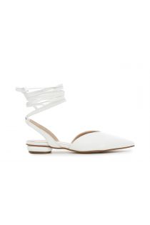 Ballerine in nappa allacciate alla schiava dalla forma affusolata in punta. Tacco basso fasciato dello stesso materiale della tomaia