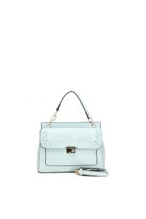 Baluetto di medie dimensioni con la pattina frontale rifinita da una importante infilatura in similpelle. Accessorio personalizzato CN sul manico e chiusura impreziosita di strass