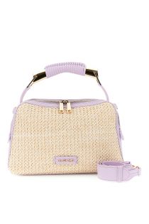 bauletto in raffia con pattina e rifiniture effetto pelle a contrasto crema/lilla
