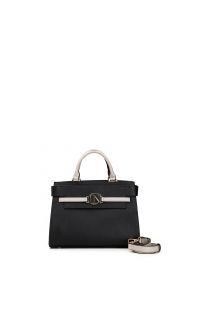 Bauletto rigido bicolore dall'allure raffianta ed elegante con finta pattina e passante con accessorio CN. Manico e tracolla in contrasto.