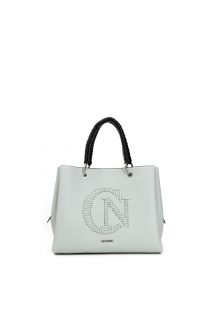 Bauletto sfoderato con manici intrecciati e logo realizzato con infilature di sintetico sul quadrante anteriore