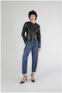 Giubbino girocollo realizzato in similpelle con inserti in tessuto elastico per aumentare il comfort. cerniera centrale. linea basic che dona eleganza e semplicità.