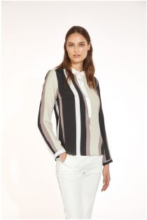 Blusa realizzata in un marocain di viscosa stampato caratterizzata da un ampio scollo bordato in contrasto colore. Maniche lunghe con leggera arricciatura sul fondo.