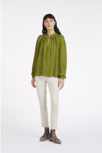 Blusa con manica arricciata e colletto increspato chiuso da un nastro di tessuto