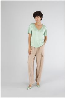 Blusa a maniche corte dalla vestibilità over realizzata in satin di viscosa. dettaglio con rib e lurex a rifinire la scollatura a "v". la blusa è perfetta come sottogiacca da abbinare a completi e tailleur.