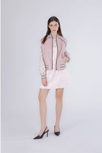 bomber in similpelle con maniche in pizzo rosa