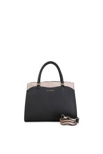 Bauletto dalla struttura rigida in saffiano con dettaglio curvilineo sul quadrante frontale.