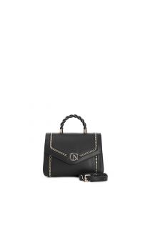 Borsa a mano con applicazione di catena in metallo dorato e logo cafènoir. manico in metallo con tubo. chiusura con calamita. tracolla removibile.