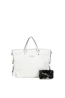 Borsa a mano con allacciature sui fianchi tramite delicate fibbie. Possibile indossarla anche con portabilità diversa grazie all'aggiunta di una particolare tracolla arricciata in contrasto colore