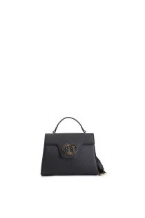borsa a mano con pattina in saffiano con logo ovale smaltato in tono nero