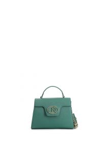 borsa a mano con pattina in saffiano con logo ovale smaltato in tono verde