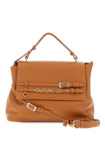 Borsa a mano con pattina in similpelle effetto pelle con grana dettagli con cinghiette fibbiette e lettering cafènoir. tramezza interna con zip e tracolla removibile.