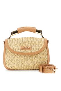 borsa a mano in raffia con pattina e rifiniture effetto pelle a contrasto naturale