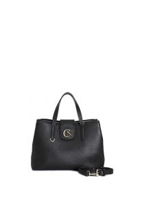 Borsa in pelle martellata con manici piatti tramezza con zip e pattina decorativa con logo. dotata di tracolla removibile per versatilità ed eleganza.