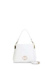 borsa a secchiello in pelle liscia con logo smaltato bianco
