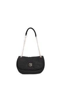 Borsa a spalla con pattina effetto puffy con logo in metallo. chiusura con calamita. tracollina in catena.