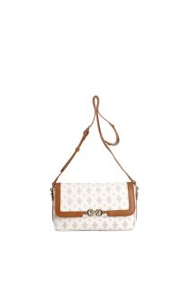 Elegante borsa a spalla con pattina stampa monogram rifiniture a contrasto tracolla regolabile con spallaccio tasca aperta posteriore logo in metallo.