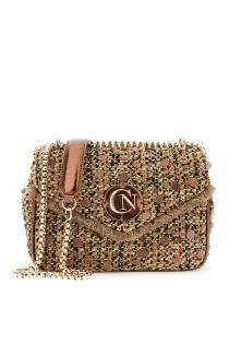 Borsa a spalla con pattina in tessuto boucle' con applicazione di paillettes tramezza con zip interna.tasca sul retro tracolla in catena e rifiniture in metallizzato. spallaccio con imbottitura logo in metallo e frangine in tessuto.