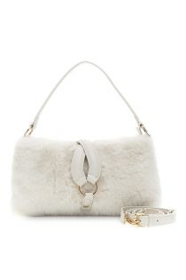 Borsa a spalla in pelliccia sintetica con fascia decorativa e anello. logo sul retro e tracolla removibile con moschettoni per una portabilità versatile e chic.