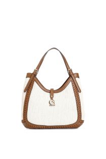 borsa a spalla in rafia con rifiniture a contrasto e charm in metallo naturale
