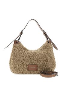 Borsa a spalla in tessuto ricciolino con dettagli effetto pelle a contrasto. placchetta frontale con infilature e logo tracolla removibile per doppia portabilità.