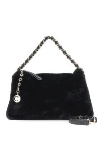 Borsa a spalla morbida in pelliccia sintetica con tracolla a catena infilata e charm in metallo con logo cafènoir. dotata di tracollina removibile per doppio stile.