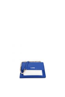 Borsa a trapezio con tasca controcolore e pattina. chiusura a calamita. tracolla di catena infilata e logo controcolore.
