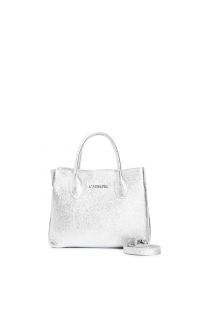 borsa con manici tubolari in pelle metallizzata argento
